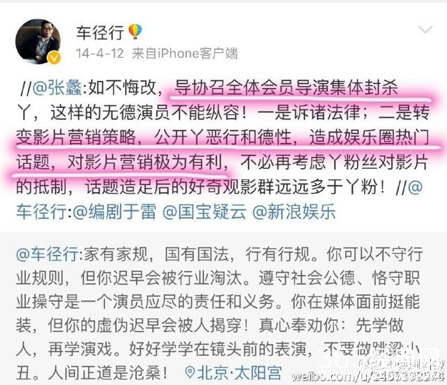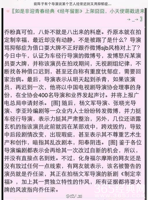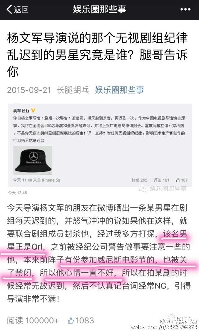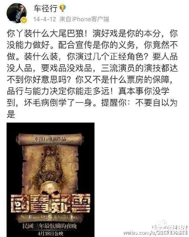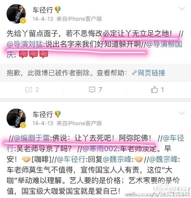 可小编注意到的事,这次炒作事件事有蹊跷,这两个导演,车径行是在14年4月12号骂的演员,15年9月21号又转一个导演杨文军的话,警告一个演员从明天起不能再迟到,不然就封杀。到底是什么演员,会让两个在不同年份公开声讨,是真的某些粉丝口中所说的恶意封杀吗。可是在那个时候,小编是记得,没有人知道这两个导演口中说的就是乔任梁?因为这两个导演抨击的只是这种现象,而那疑似乔微博的反驳也是很快就删了,所以这件事也就不了了之。只不过是被网友“徐叉叉徐勾勾”网友及时截图了而已,因为当时没有引起关注,也不知道说的是谁,认为如此不敬业的不可能是自己心中的偶像,网友在导演微博反而指责的那个耍大牌,不敬业的演员,甚至还有人要这个演员滚出娱乐圈的评论。就是因为梁因为抑郁症莫名死去了,又有人在今天说某某导演前年去年说的那个演员就是乔任梁,就纷纷把矛头指向导演了。