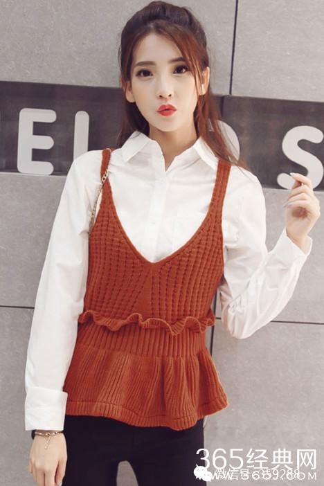 秋季新款女装韩版甜美套头短款荷叶下摆针织衫白色衬衫两件套