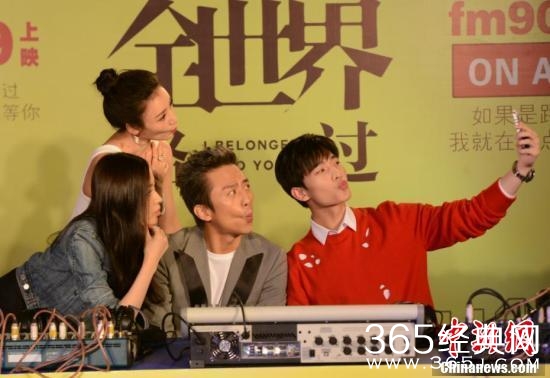 邓超、杨洋、张天爱、柳岩四位主演还在现场玩起了搞怪自拍。(钟欣 摄)
