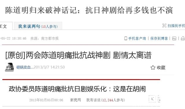 有段时间,抗日神剧十分泛滥,于是,陈道明再次发飙,说抗日剧太娱乐化、剧情太离谱。他还表示,就算给再多钱也不会演这样的戏▼