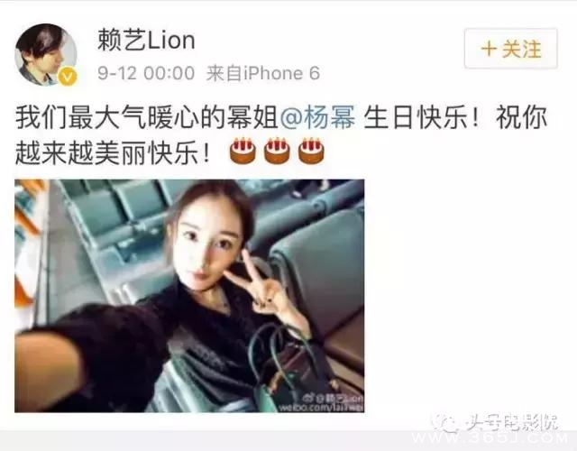 杨老板生日的时候,赖艺也发了微博祝福,称杨幂为“最大气暖心的幂姐”。