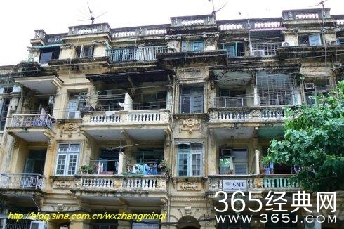 因地处热带,大量雨水的侵袭,使得仰光很多建筑长满了青苔,看上去都是黑乎乎的。