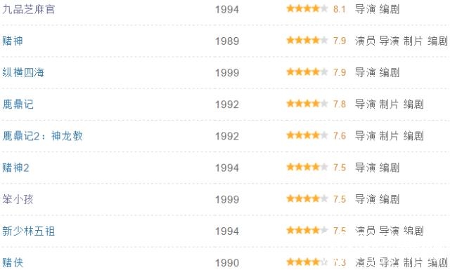 耐人寻味的是,上面这些片里,《九品芝麻官》、《鹿鼎记》、《鹿鼎记2:神龙教》、《赌侠》,都是由周星驰主演。