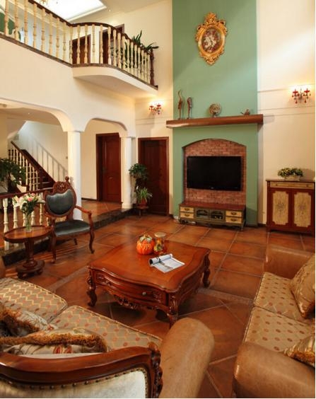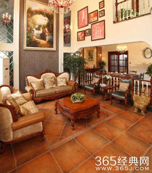 欧式比较经典的古老装修风格,加上墙壁挂上的艺术画,烘托出一种温馨的感觉。加上古典的地砖,欧式的韵味更加浓郁了。