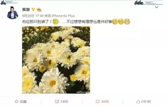 黄渤在昨天下午五点多的时候发了一条微博,图里面是一片花丛中,左边一只蜜蜂在采蜜,右边则是一只苍蝇停留在上面,意味深长。