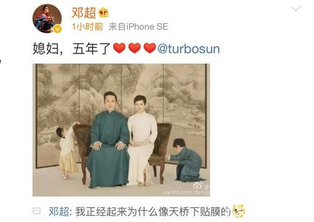 6月7日是邓超孙俪的婚礼五周年纪念日,(全家福)邓超穿了一件青色大褂,而孙俪则是一袭白色旗袍,显得非常素简,时尚着还散发着一民国男文青女文青的味道。很有特色呢!