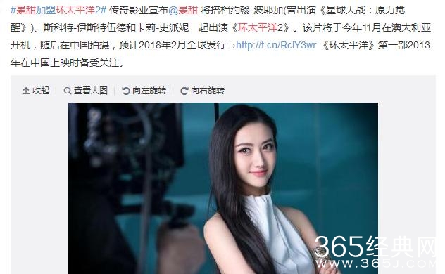 传奇影业宣布景甜加盟《环太平洋2》,角色未知。按照大甜甜以往的经历来看,绝对是个女二号以上的角色。