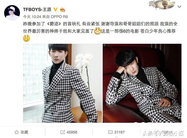 昨天源宝也出席了电影《爵迹》的首映礼,今天发博文称:“有些紧张 谢谢导演和哥哥姐姐们的照顾”,还特别可爱的说“我演的全世界最厉害的神终于能和大家见面了”,简直激萌!