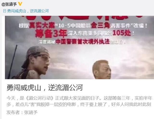 勇闯威虎山,逆流湄公河,这是张涵予为自己今天上映的又一力作《湄公河行动》写的感想。