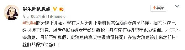 昨天晚上开始,就有人从天涯上爆料称某位G姓女演员坠崖,目前医院已经封锁了消息。然后各路G姓女星纷纷躺枪!