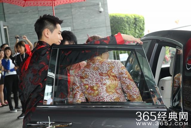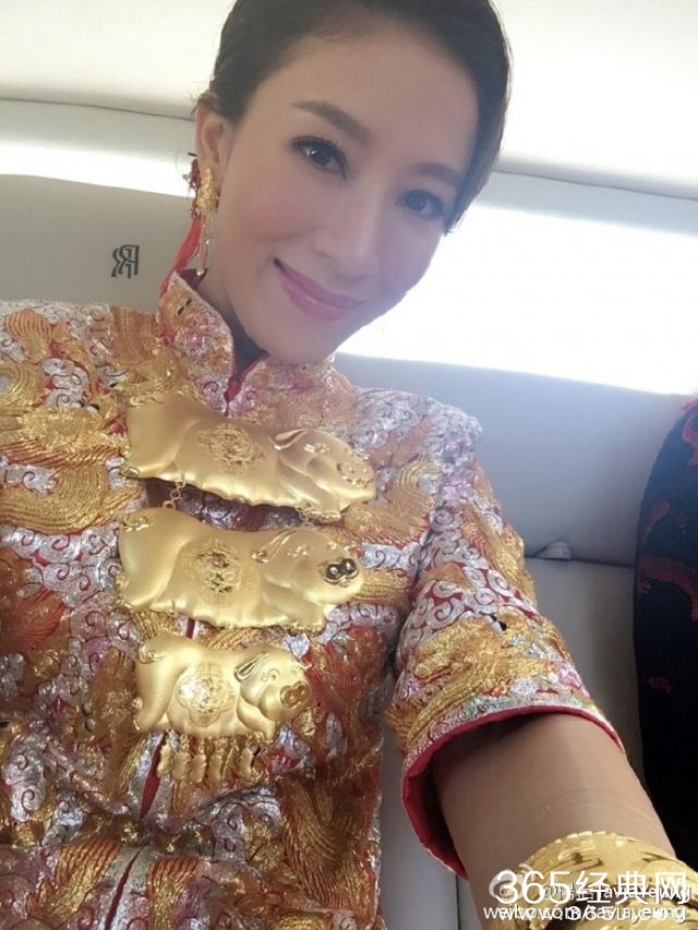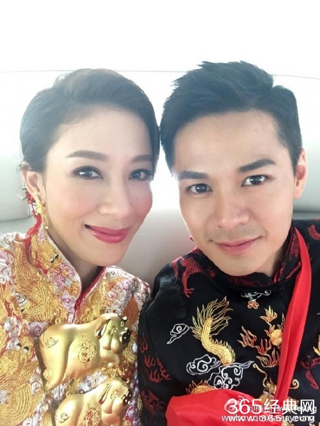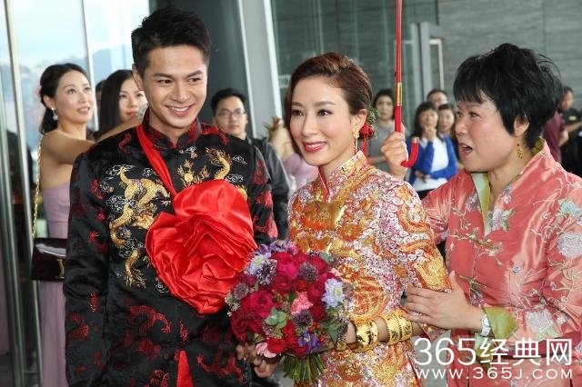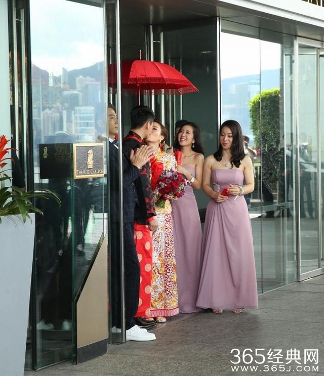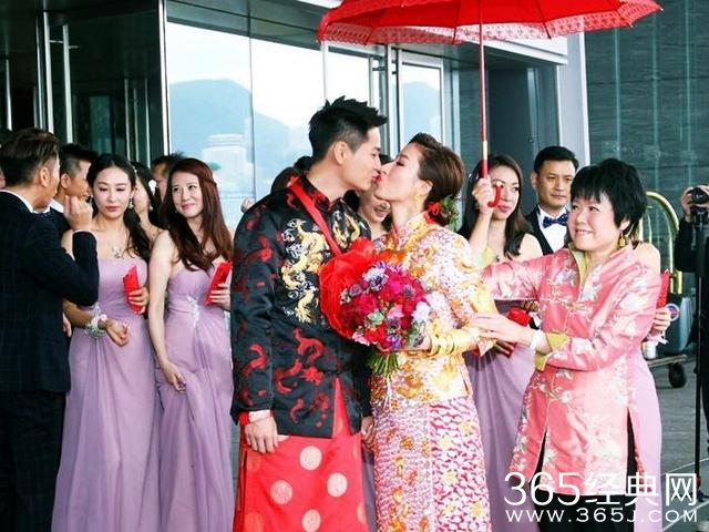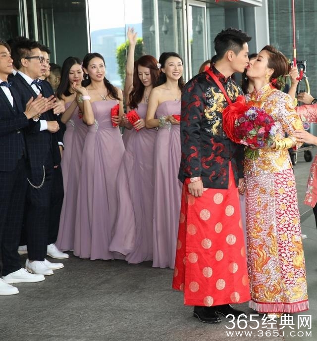 新娘杨怡胸前戴3只金猪,手上共有10只龙凤金手镯,一对新人应媒体要求亲吻了4次,之后登花车又再吻2次,总之吻个不停。
