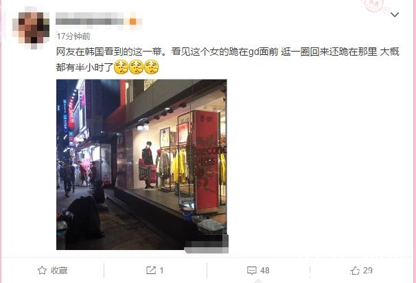 网友在韩国看到的这一幕:看见这个女的跪在gd面前,逛一圈回来还跪在那里,大概都有半小时了~粉丝对偶像的感情让人……怎么说呢?是不是有点疯狂?目前粉丝的国籍不明,不知道权志龙看到作何感想?