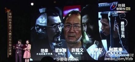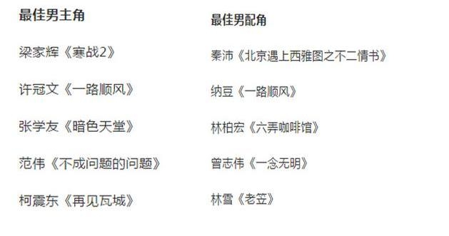 梁家辉【寒战2】,许冠文【一路顺风】,张学友【暗色天堂】,范伟【不成问题的问题】。