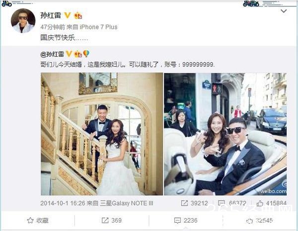 娱乐专稿(记者/罗学成)十月一日,凭借《好先生》大放异彩的孙红雷在微博上公开了一组婚纱写真,自曝喜事“结婚了”,并调侃大家可以送礼了,“哥们儿今天结婚,这是我媳妇儿。可以随礼了,账号:999999999。”