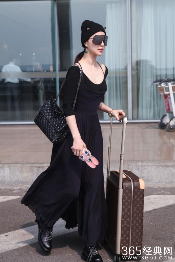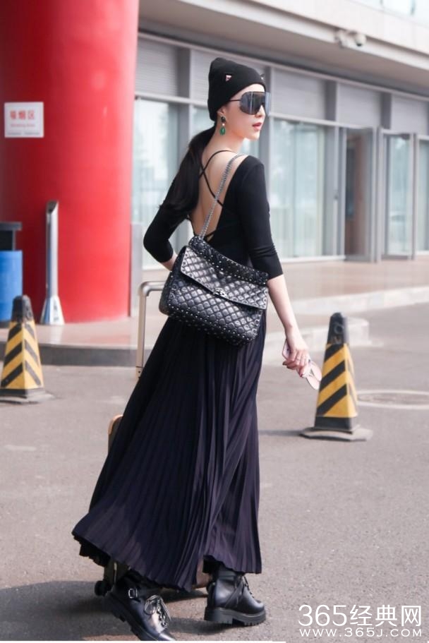 二人先后在北京机场被拍到,冰冰亦是全黑打扮登机,配上黑超和猫咪帽,而最特别的是大连身长裙;
