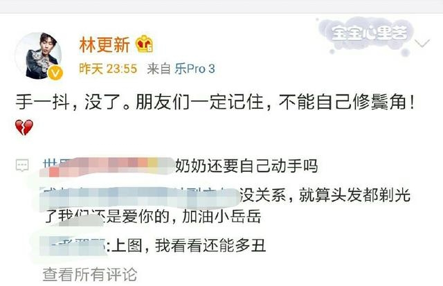 10月一日晚林更新更新微博,称自己动手修鬓角手一抖没了,还劝网友不能自己修鬓角。可是为什么不配图?还得自己想象,这不是为难网友吗?