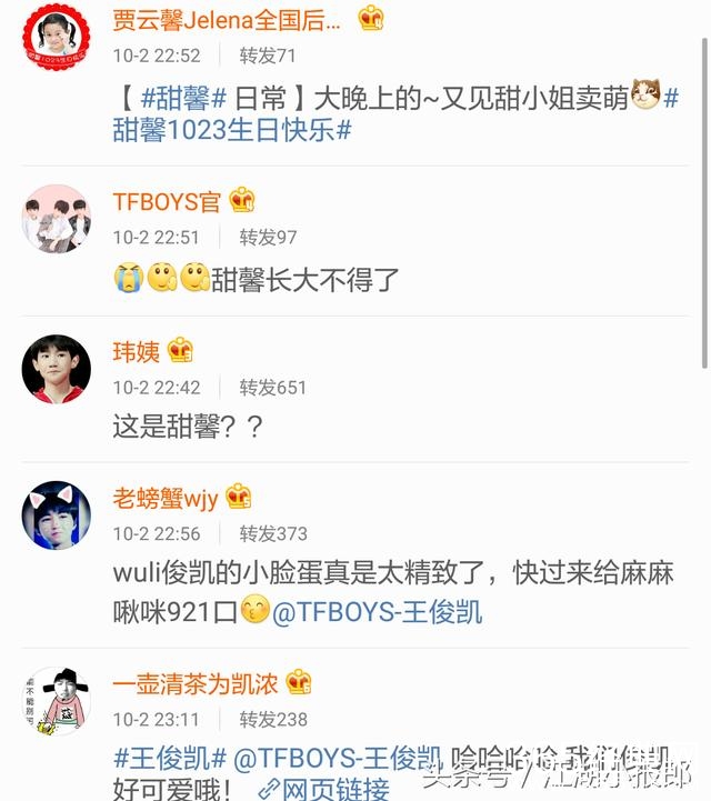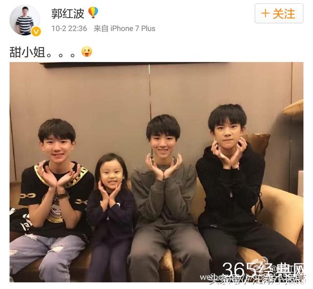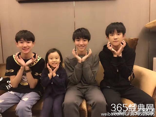↑甜馨和TFboys的王俊凯、易烊千玺、王俊凯同框合照,四人手做捧脸卖萌状!