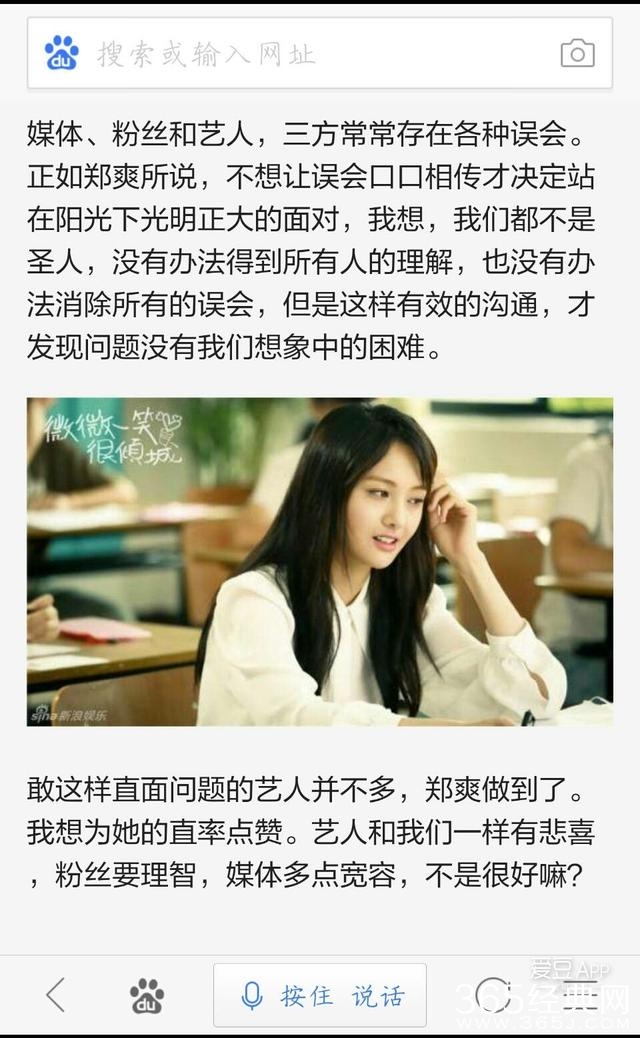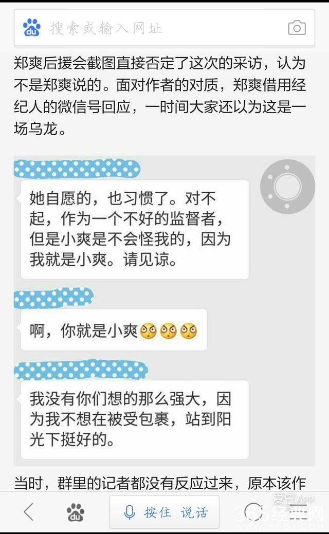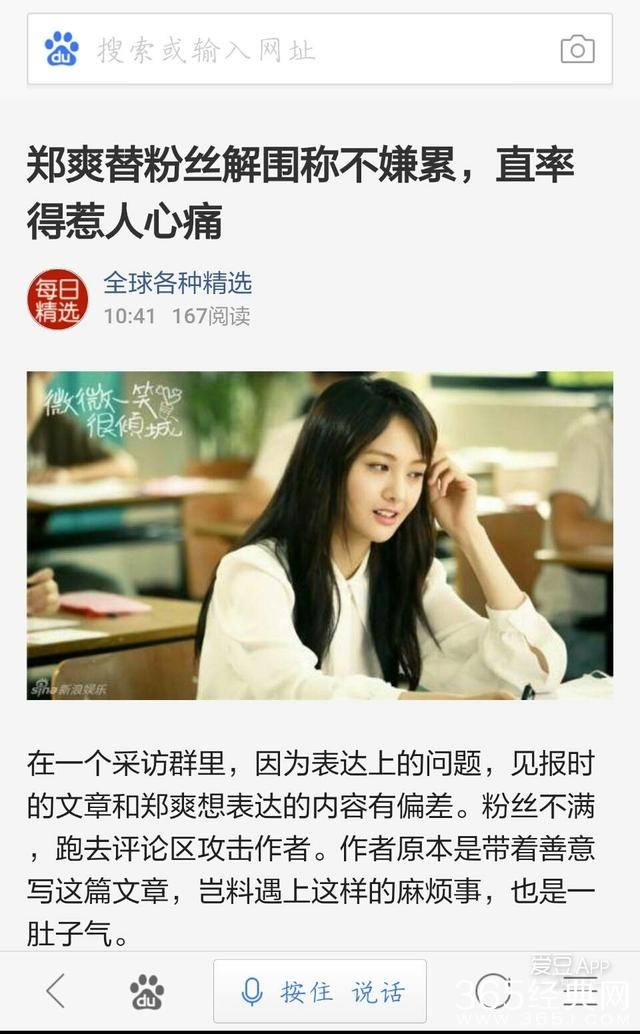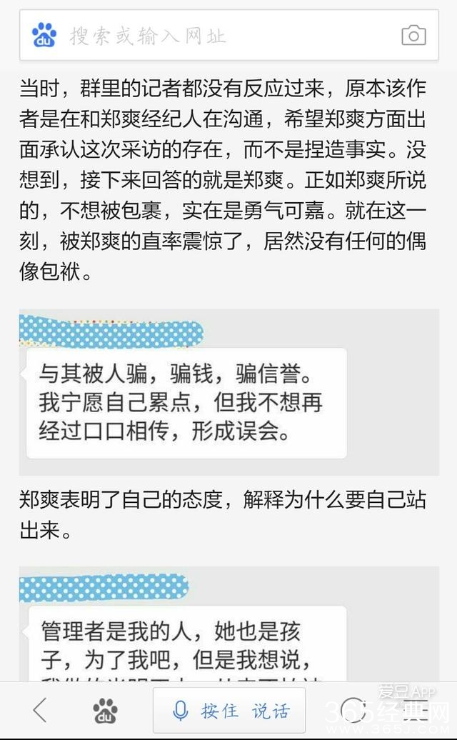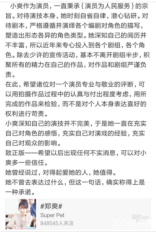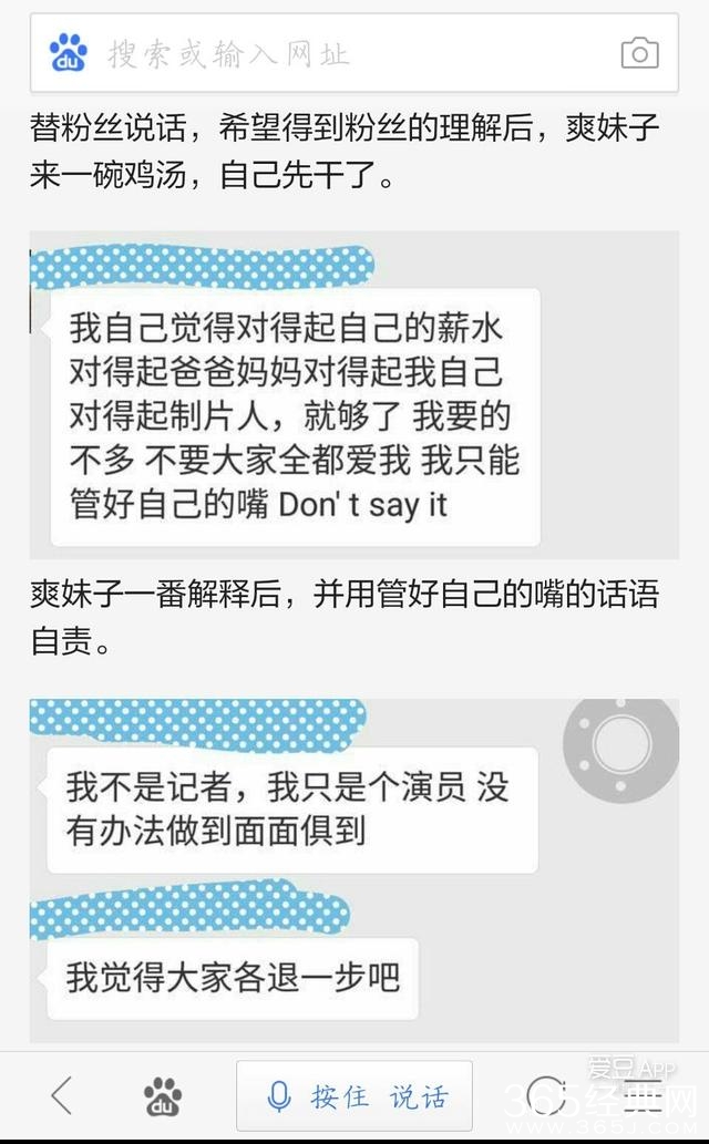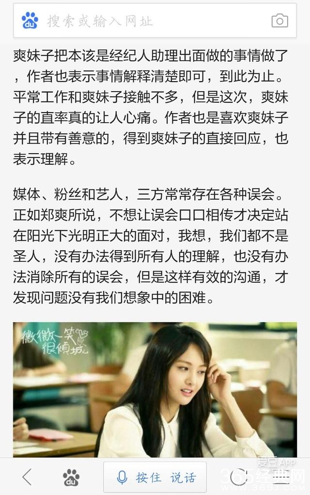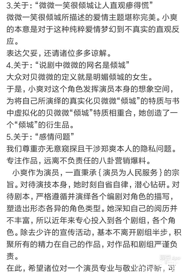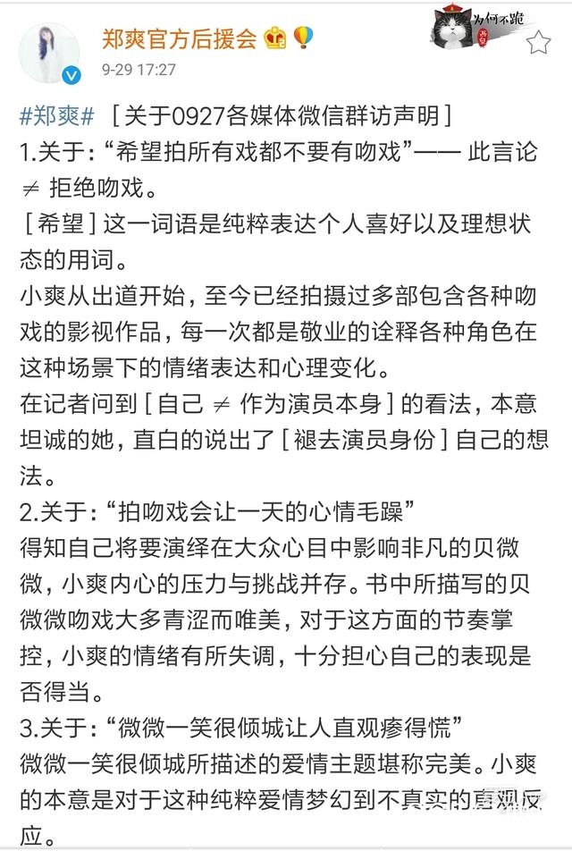 相信大家都看了那个微信群访!♥其实里面小爽说的话没有任何不妥她一直都是很真诚问题任何一个问题!从来不会修饰自己那么纯粹那么真实!♥但是有不少报道小编为了博点击率就抓她说话的漏洞把她的原话进行篡改!让不少网友都误会了小爽!比如小爽说“拍吻戏能毛躁一天”结果被改成“郑爽说和杨洋拍吻戏能毛躁一天,想不到你是这样的郑爽”不少网友都被误导了!其实了解小爽的人就知道小爽以前刚刚开始拍戏就说过有点排斥吻戏!不是针对杨洋更不是针对微微一笑很倾城!希望大家不要误会她!♥还有所说的“希望所有戏都不要有吻戏”不等于拒绝吻戏!只是表达期望而已!详细请看下面图文解释!而小爽本人也进行了解释!从字里行间都感受出她三观真的非常正!请大家不要误会这样善良的她!理智不要被恶意营销号带偏!♥“你们的女孩!为什么不信任”