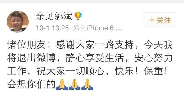 昨天中午,奥运冠军王楠的老公郭斌宣布退出微博,他在微博中写道:诸位朋友,感谢大家的支持,今天我将退出微博,静心享受生活,安心努力工作,祝大家一切顺心,快乐,保重,我会想你们的!