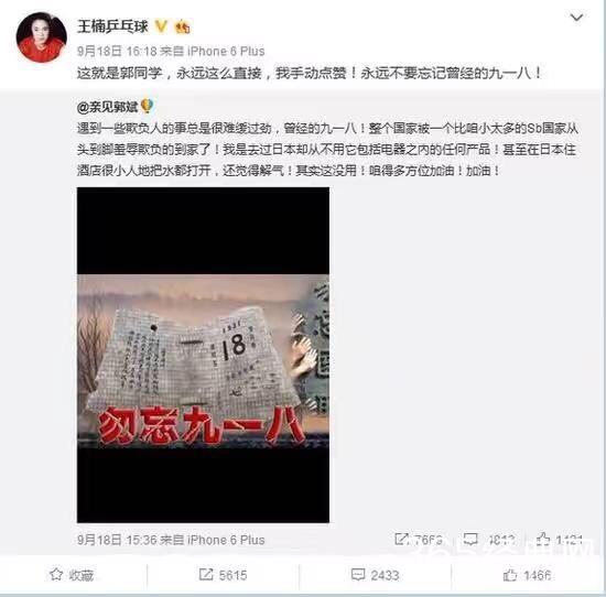 而就在这条微博发布之前,他还曾说要做真实的自己。此前,郭斌因为一件事落入到了舆论的风口浪尖,就连王楠也被牵涉进来:九一八85周年当天下午,他发了一条微博,王楠也转发了,引起了不小的争议。