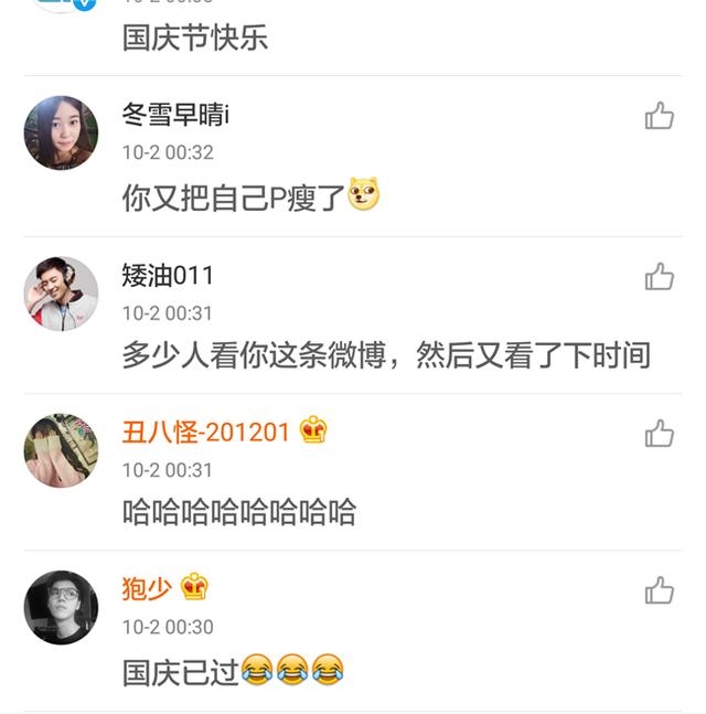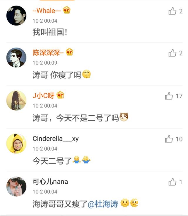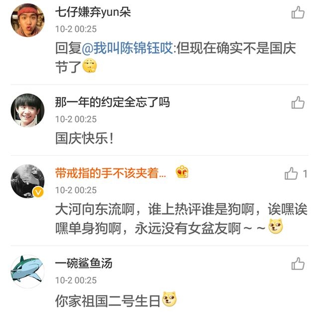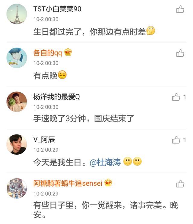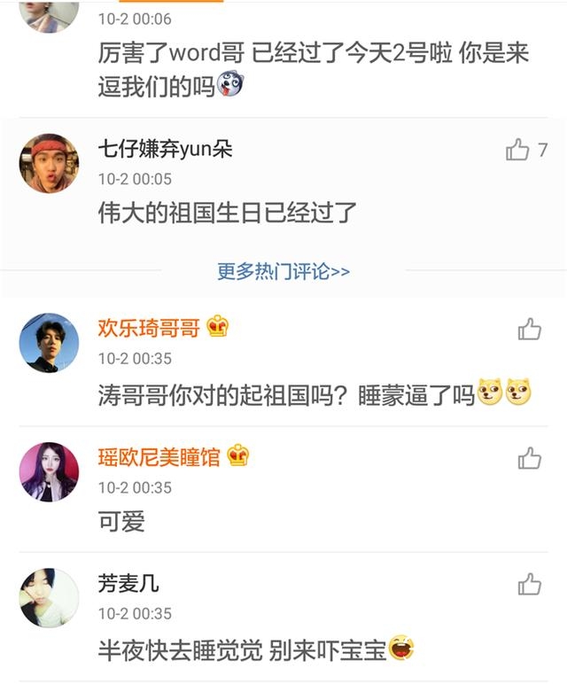 越来是发微博的时间出了问题,祖国母亲十月一号生日,但是屋里海涛的祝福微博却是在十月二号这天发的,这就有点尴尬了。虽然是深夜,但是海涛这条微博的下面还是炸开了锅~