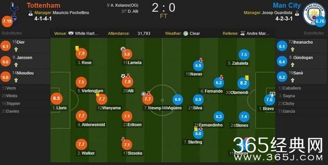 此后双方再无力改写比分。最终全场战罢,热刺主场2-0力克曼城,终结了后者开赛以来的不败战绩。