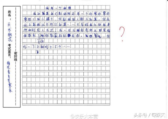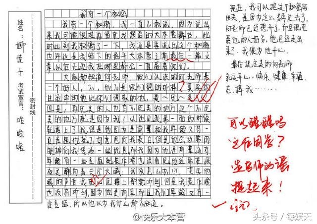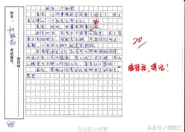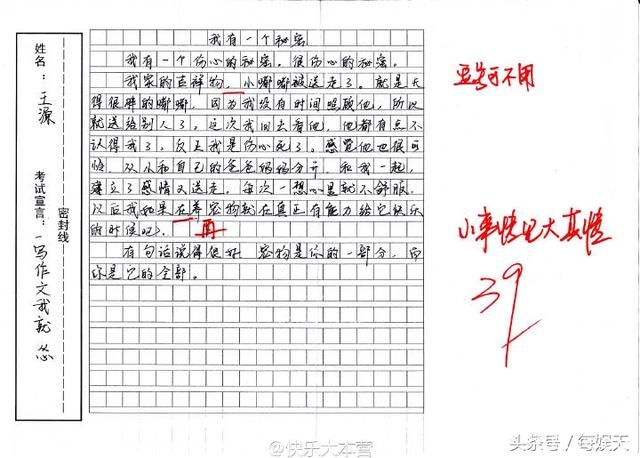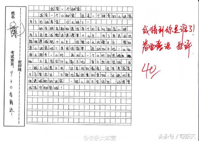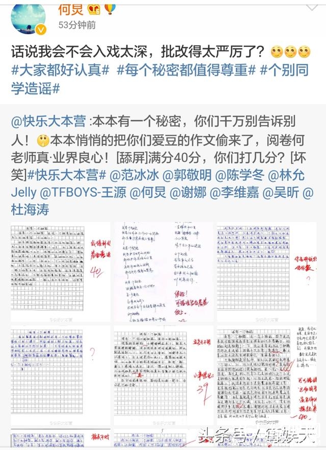 本本有一个秘密,你们千万别告诉别人![嘘]本本悄悄的把你们爱豆的作文偷来了,阅卷何老师真·业界良心![舔屏]满分40分,你们打几分?[坏笑]#快乐大本营# @范冰冰 @郭敬明 @陈学冬 @林允Jelly @TFBOYS-王源 @何炅 @谢娜 @李维嘉 @吴昕 @杜海涛,你们都能猜到下面都是谁写的吗?