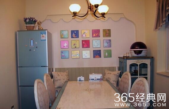 餐桌和餐边柜款式是美式,颜色上比较符合地中海风格,完美的融合在一起。餐厅靠墙还设置了卡座,节约座椅不说,还hi有收纳功能