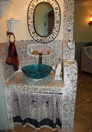 卫生间弄得比较梦幻一点。贴了已大块的马赛克、洗手台是在为卫生间外面的。平常洗手也比较方便。