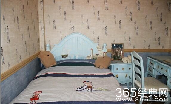 儿童房只完全的地中海风格了。墙面都是贴的壁纸。多用蓝色,小朋友现在好跟我么睡主卧,现在也一起准备好。