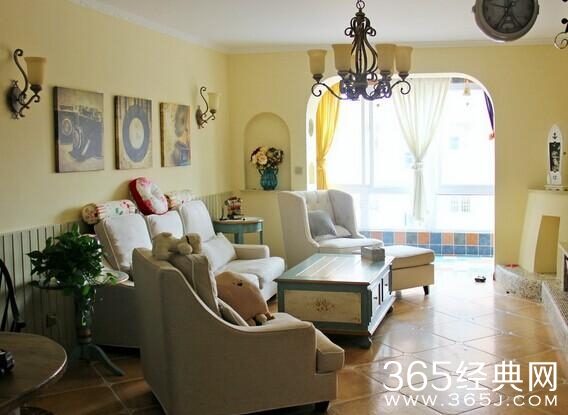 这是客厅的照片。沙发比较美式,茶几和样袋的地砖都是地中海风格风。还有吊灯,算是美式的灯,但又有地中海的味道。独立沙发是我最喜欢的。