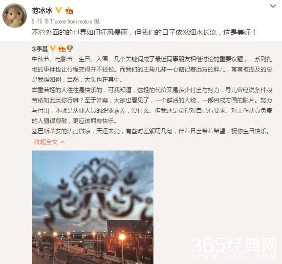 圣塞巴斯蒂安电影节开幕那天还正好是范冰冰的生日,热点中的热点。各种明星名人纷纷发来贺博顺便祝福冰冰入围的影后能拿到。这里李晨的关键词归纳的很好:“中秋节,电影节,生日,入围” 。(这两年生日营销都是撒狗粮,去年是李晨和范冰冰家人一起庆祝,今年是在电影节宣传期增加热度。)