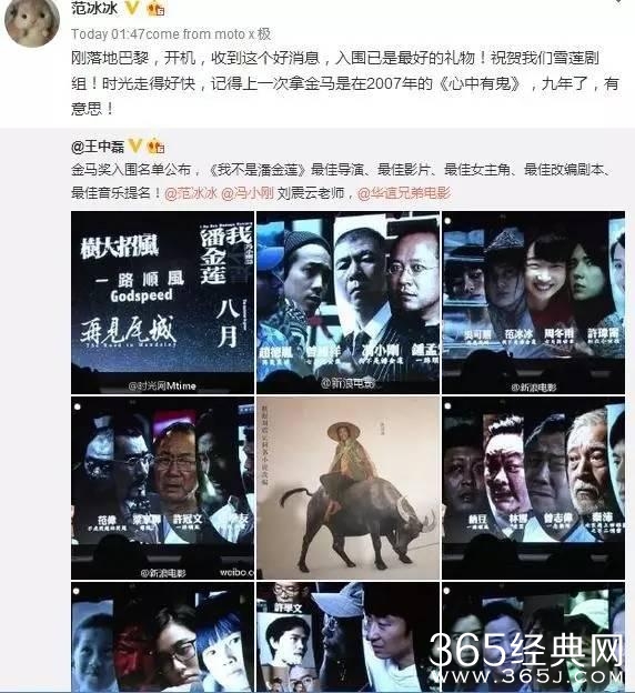 之后金马奖影后提名曝光,范冰冰凭借《我不是潘金莲》入围。所以是又要收一个影后皇冠了吗?(这算国庆期间的小热点,西班牙影后+金马影后入围,会激发起大规模关于“范冰冰演技”讨论的热潮,而事实上,范冰冰之前《苹果》,《观音山》中的表现力还是不错的,此前也凭借《心中有鬼》拿过金马最佳女配,只是因为美貌和热点太多,掩盖了演员的基本技能。)