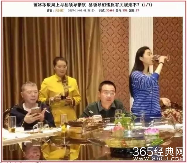 拍戏间隙冯小刚范冰冰和剧组陪婺源县政府官员吃饭,透出来的图是范冰冰和一官员在豪饮,原本剧组的正常应酬又被打上了“三公消费”标签。(这照片肯定是内部发送出去的,也就是为了做前期造势,间接也是把剧中人物形象和范冰冰本人做了一些融合)