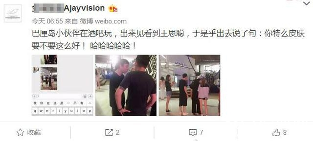 网友晒照说:巴厘岛小伙伴在酒吧玩,出来见看到王思聪,于是乎出去说了句:你特么皮肤要不要这么好! 哈哈哈哈哈!
