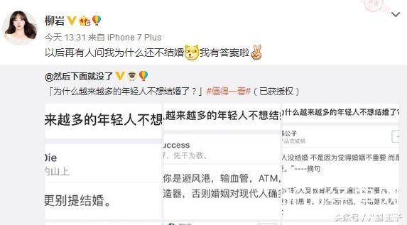 日前,柳岩更新微博称:以后再有人问我为什么还不结婚,我有答案啦!并且上传了一组照片: