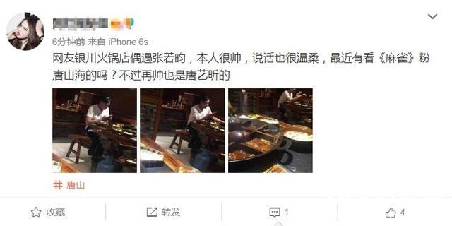 网友晒照说:网友银川火锅店偶遇张若昀,本人很帅,说话也很温柔,最近有看《麻雀》粉唐山海的吗?不过再帅也是唐艺昕的。