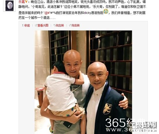 昨日晚,乐嘉晒出与张卫健的合影,并附文“晚住江山,酒店小弟冲我诡异地笑,说光头喜欢成双吗,我不动声色,心下乱跳,镇静地问,‘小哥高见,此话怎解?’这位小弟不屑地说,‘乐大哥,你别装了,难道你和张卫健不是结伴前来的吗?’自打演说家去年我和dicky洒泪别后泪,我们未曾相逢,想不到居然在一个城市一个酒店。”