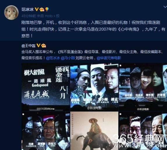 今天凌晨,范冰冰在微博发文感谢剧组:“刚落地巴黎,开机,收到这个好消息,入围已是最好的礼物!祝贺我们雪莲剧组!时光走得好快,记得上一次拿金马是在2007年的《心中有鬼》,九年了,有意思!”