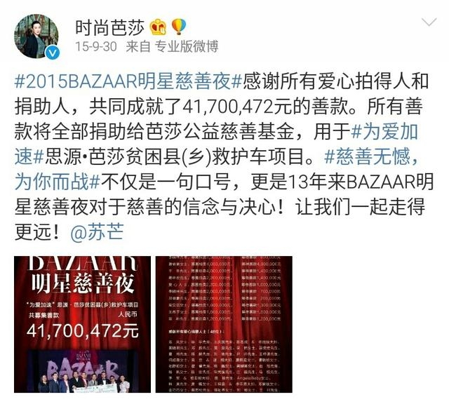 今年的明星芭莎慈善夜总共募集了75,261,679元善款。昨天凌晨时尚芭莎公布了捐赠人名单并对捐赠人表示感谢。