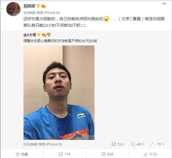 方博在微博写道,“调整状态跟心情最好的方法就是不停的出汗[加油]”,应该说这是一条非常正能量的微博,但没想到还是难逃被怼的命。在方博的微博发出不到一小时后,就收到了刘国梁的怒怼,“还好你是太阳能的,自己总能找点阳光就灿烂……(北京雾霾)难怪你回国家队就只能24小时不间断出汗吧”