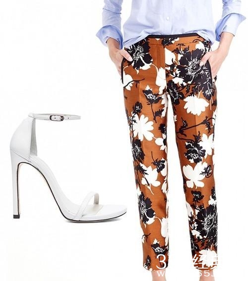 Stuart Weitzman 白色皮革高跟鞋(左)J. Crew Collection 赭色底白碎花裤