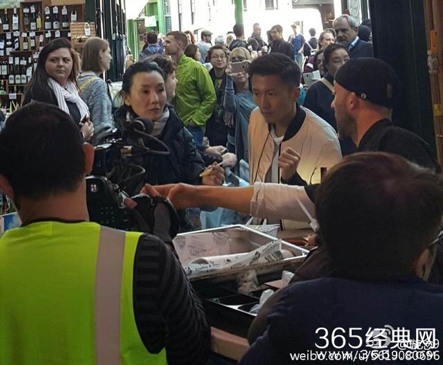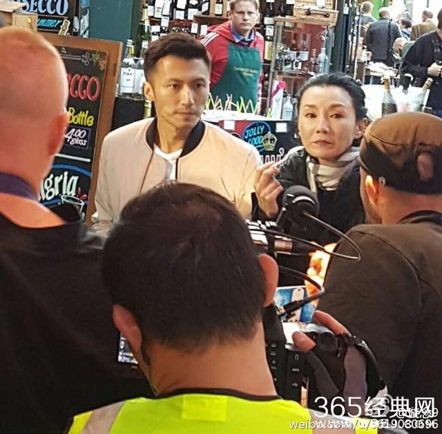 谢霆锋在看监视器里的画面,张曼玉在和一个外籍工作人员交流,身后围观群众人山人海。