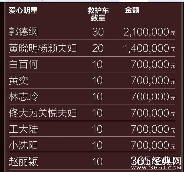 其中郭德纲捐款210万,排在第一位,而一向热衷于慈善的黄晓明和baby夫妇也出手阔绰,捐款140万。