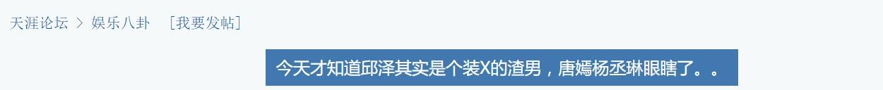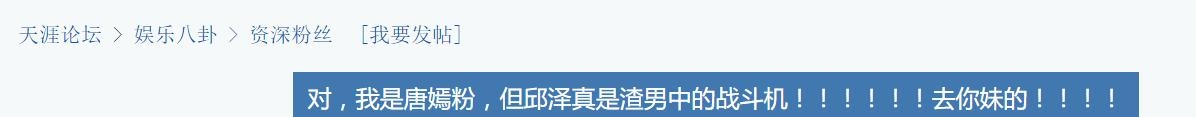 疑似邱泽被爆当时是脚踏两只船的样子,知道真相后的唐嫣很是受伤,知道自己被欺骗玩弄了感情,后来邱泽与唐嫣分手了,曾有一位自称是对方助理的人,开始在网上炮轰邱泽他是无恶不作的负心汉,女方更是一度的被传因情伤自残。