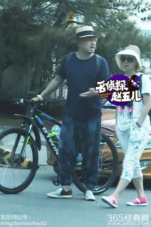 徐峥帮老婆推着自行车,俩人并肩而行边走边聊,徐峥一路比比划划,难道是在复述刚才的惊魂一刻?