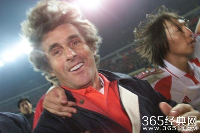 2001年10月7日,中国队成功打进世界杯,米卢和弟子李铁庆祝胜利。