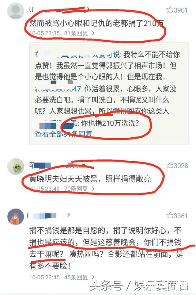 自从郭德纲陷入与曹云金何云伟的骂战后,又不少人评论郭德纲小心眼。不过,也有理智的网友反问,你也捐210万试试?面目君觉得,没捐钱的喷喷也就罢了,捐了钱的也骂?除此之外,还有黄晓明夫妇,捐款第二多,140万也是平时被黑的够惨的。看一下合影,谁捐钱了,捐了多少,那么简单明了。你们觉得呢?