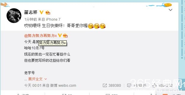 罗志祥转发张艺兴的微博,更以小绵羊特有的语气为张艺兴祝贺:“哎哟喂,生日快乐,哥哥爱你喔”
