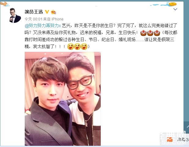 王迅,艺兴,昨天是不是你的生日?完了完了,就这么完美地错过了吗?又没来得及给你买礼物,迟来的祝福,兄弟,生日快乐!(每次都靠打时间差成功的躲过各种生日、节日、纪念日、婚礼现场……谁让我是极限三精,我太机智了!!!)